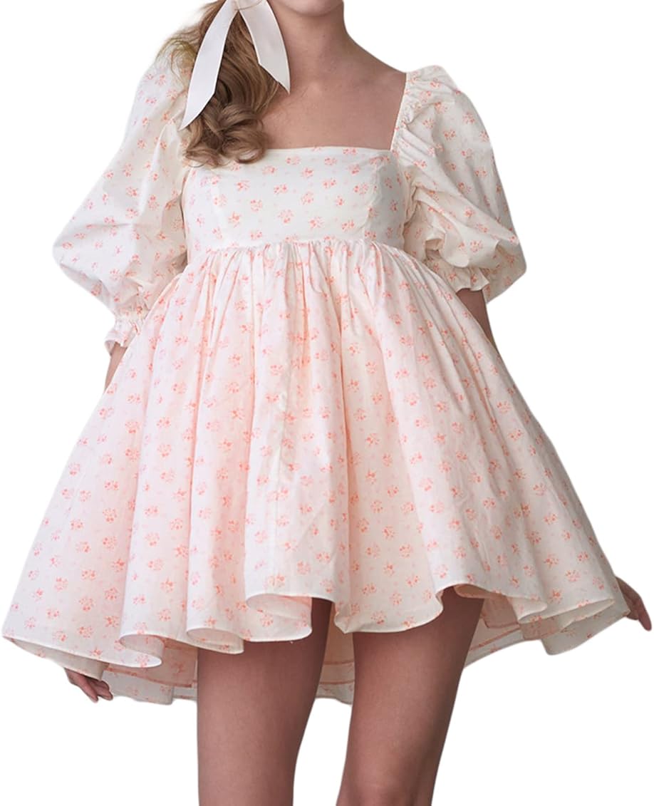 Dcohmch Women Square Neck Puff Sleeve Dress A Line Knee Length Babydoll High Waist Relaxed Fit Casual Solid Color Mini Dress Light Pink S At Amazon Women S Clothing Store